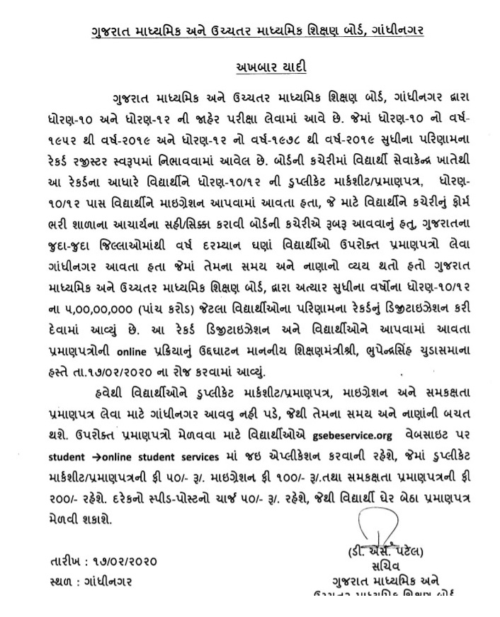 Now, students will no longer have to come to Gandhinagar to get duplicate grade sheet / certificate, migration and equivalency certificate, so that their time and money will be saved. To get the above certificates, students need to go to the online student service on gsebservice.org website and apply, in which the grade sheet / certificate duplicate fee is